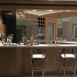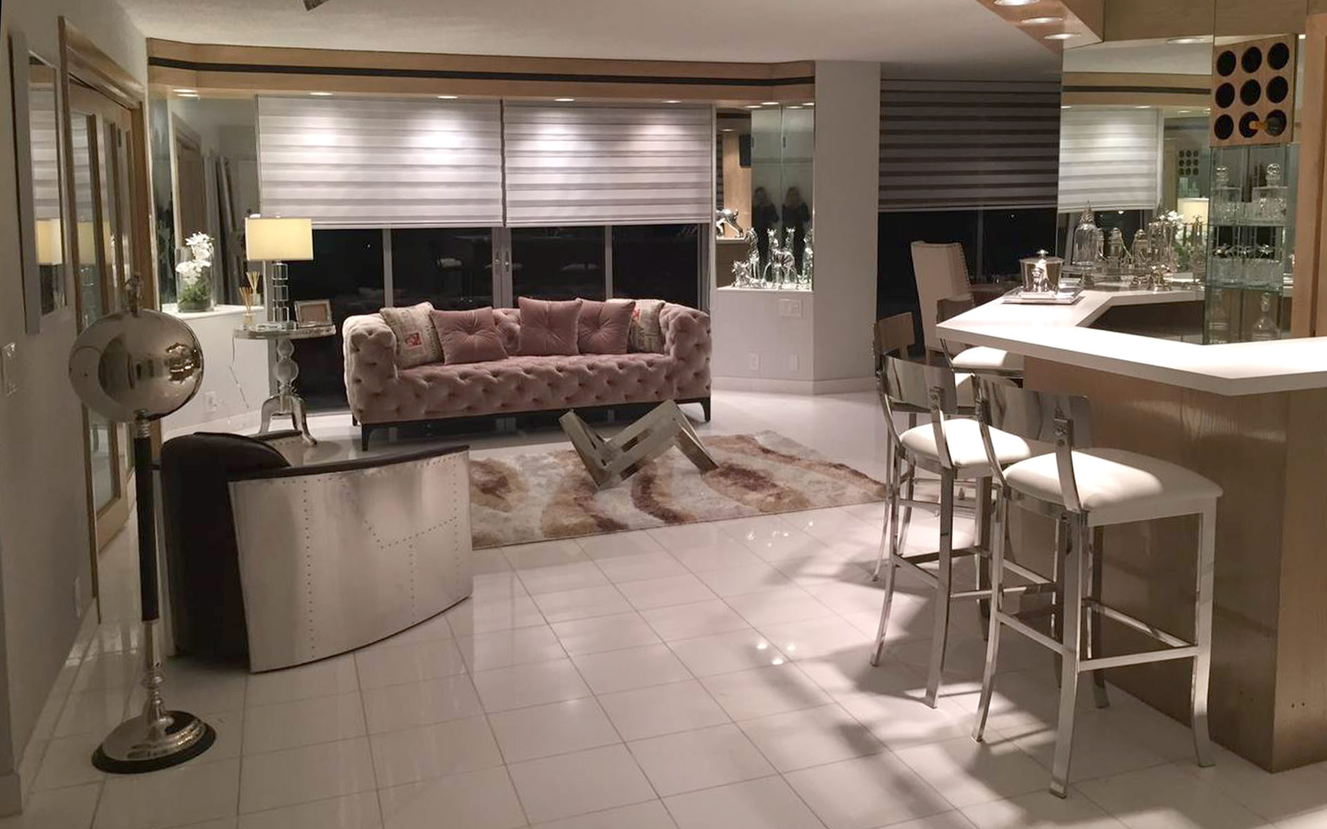 A cliente pediu para manter o bar na sala, que provavelmente foi criado nos anos 80. Então, o desafio era modernizar o ambiente, com uma decoração contemporânea, sem descartar a presença imponente do bar. Para isso foi utilizado o revestimento Marmoglass branco em toda a bancada.