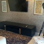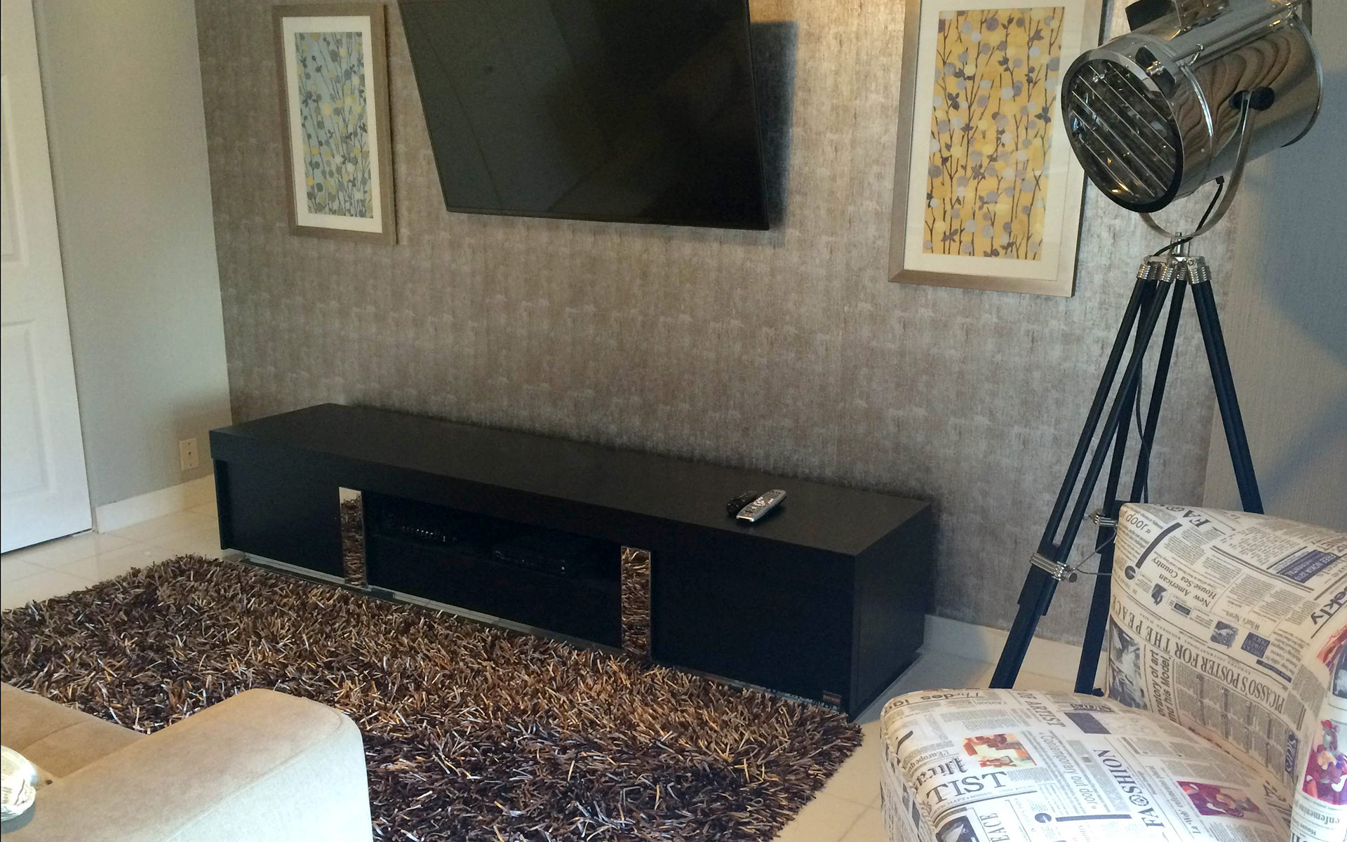 No DEN, que seria uma “sala bônus”, fiz um Home Theater, com um lindo papel de parede ao fundo que pode ser visualizado pela sala de estar e jantar. Fiz umas composições de estofado em tecido de jornal colorido, bem elegante, em uma poltrona e nas almofadas do sofá. A iluminação ficou por conta de uma luminária tripé superinteressante.