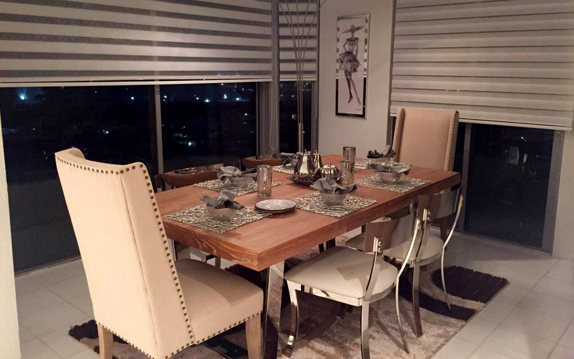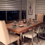 Na sala de jantar, coloquei uma linda mesa com tampo de madeira em lavagem de vela natural sobre uma base de aço inoxidável moderna, combinando com as cadeiras Maiden White. O conjunto proporciona um olhar instantâneo de sofisticação para o ambiente. Nas cabeceiras, inovei colocando 02 charmosas poltronas Morgan Rustic, que apresentam um encosto alto e uma asa traseira cheia de estilo.