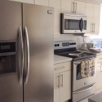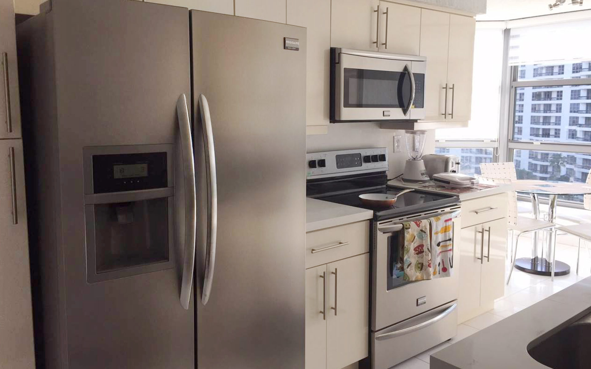 Na cozinha foi feita uma reforma tradicional. Foi colocada toda a bancada em Marmoglass branco para combinar com a do bar. E optei por colocar todos os eletrodomésticos em aço inox , para fazer um contraste de cores, trazendo mais modernidade e integração aos espaços.
