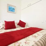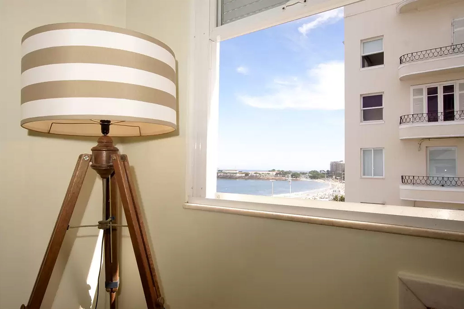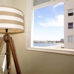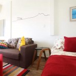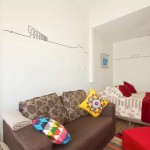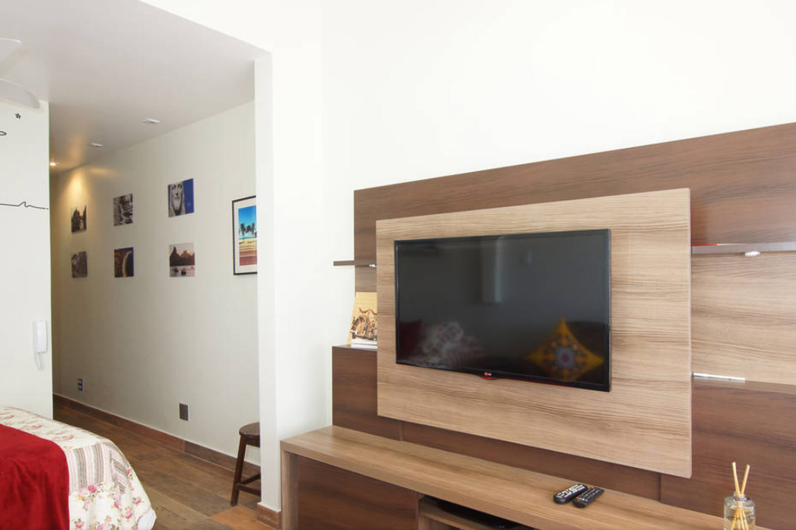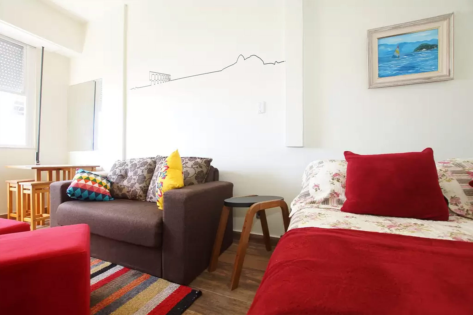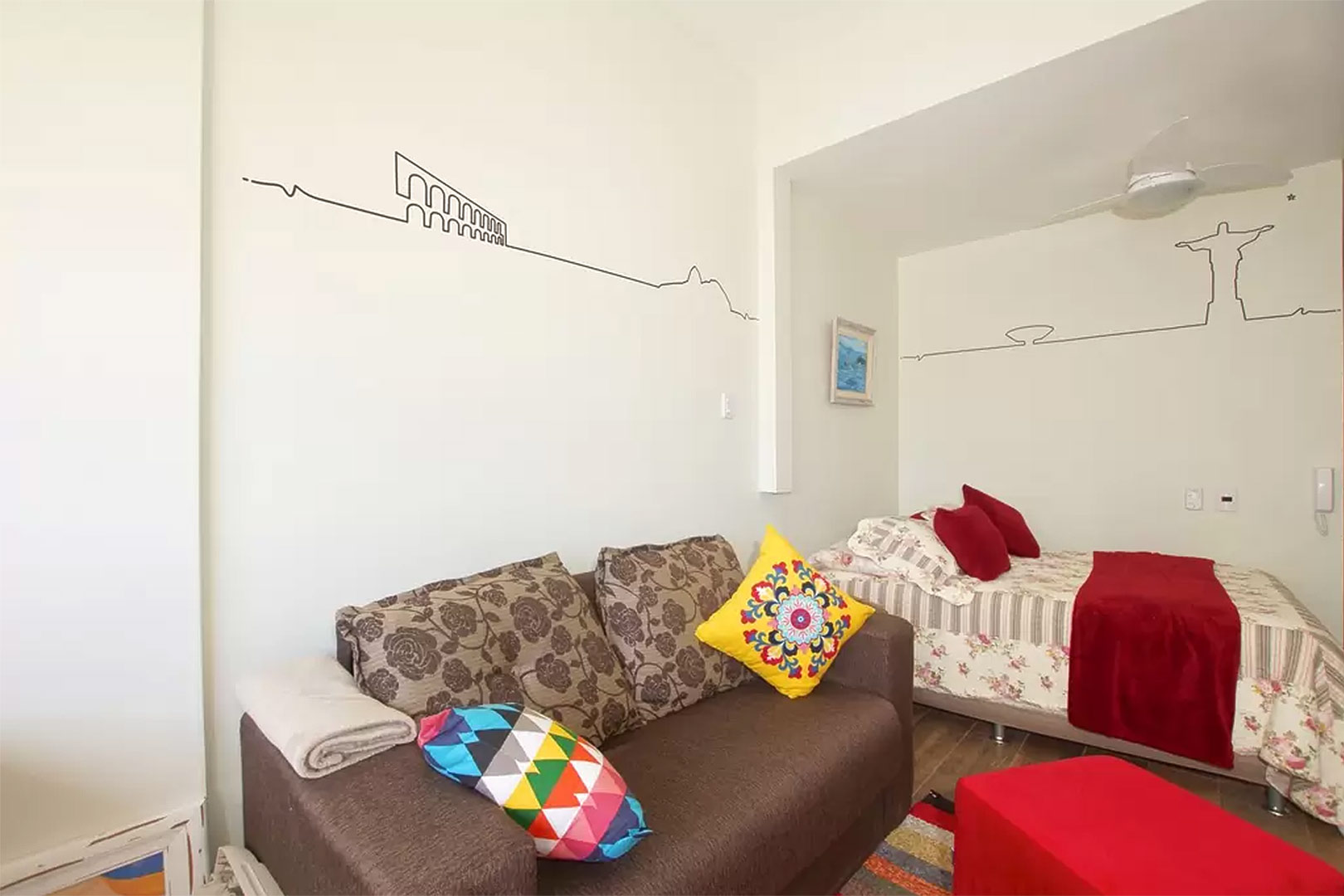 O espaço para a cama foi demarcado e separado da sala por uma persiana de tiras verticais brancas, que abre e fecha para dar privacidade e também integrar a sala de estar. Fiz uma decoração simples e com a cara do Rio de Janeiro, que utilizou nas paredes adesivos e quadros com imagens da cidade maravilhosa.