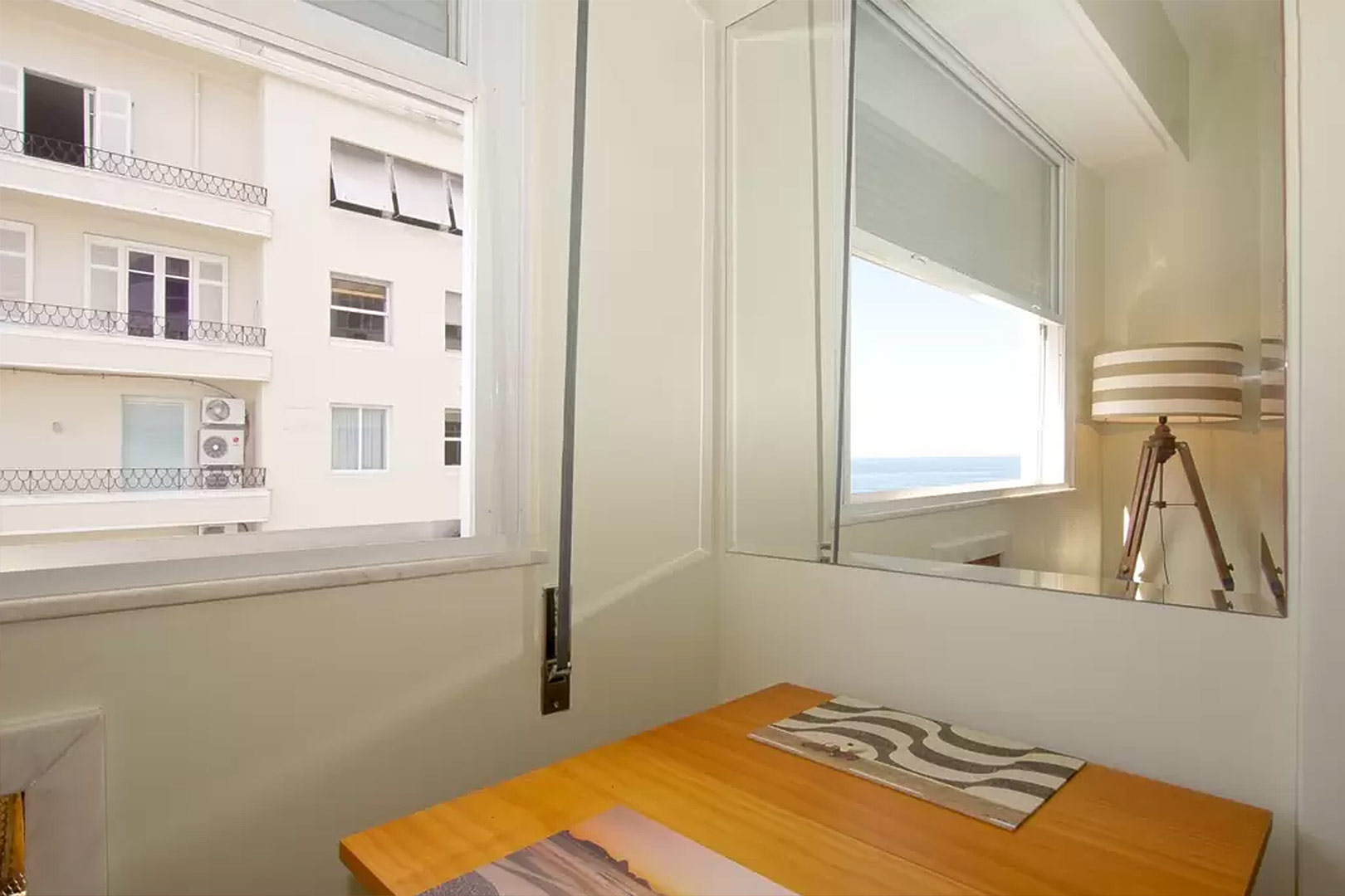 A ideia inicial foi setorizar bem cada ambiente, levando em consideração o alto tráfego de clientes que usariam o apartamento. Com isso, comecei pelo piso da circulação e da sala, revestindo-os em porcelanato que imita madeira, pois exige menos manutenção, tem maior durabilidade e a consciência ecológica e o bolso agradecem. Para demarcar bem o espaço da copa, coloquei um friso em mármore, fiz a soleira e usei um porcelanato que imita ladrilho hidráulico. Nas paredes da copa, utilizei pastilhas 10 x 10 cm, em tom de bege e na bancada, o granito branco ceará. Já no mobiliário, realcei usando um tom amarelo vibrante com branco leitoso, fazendo uma escala de cores fortes.