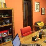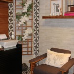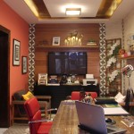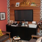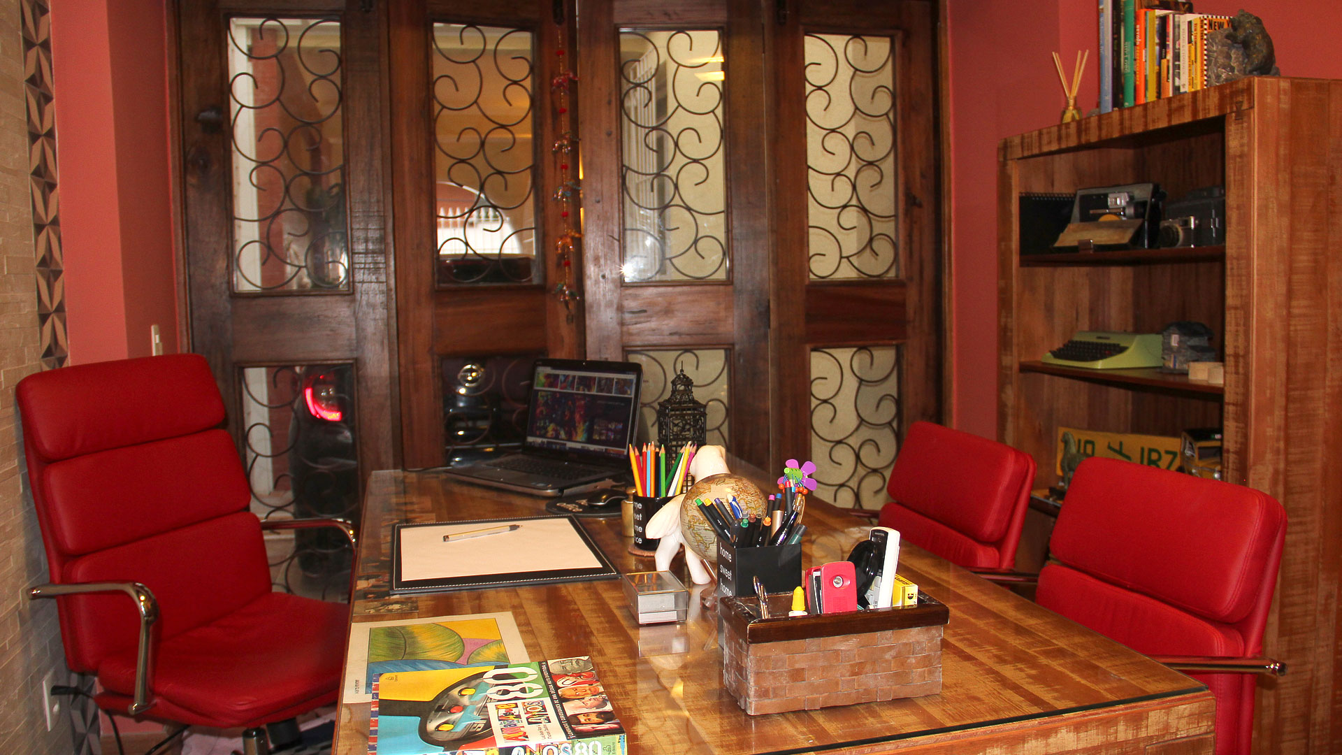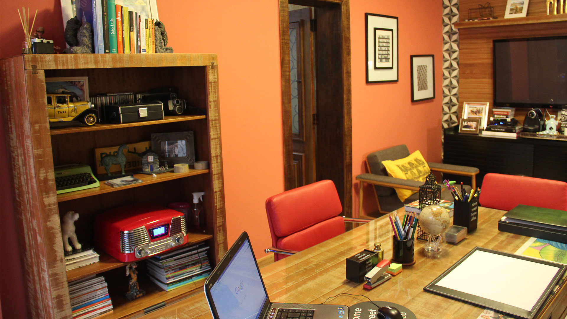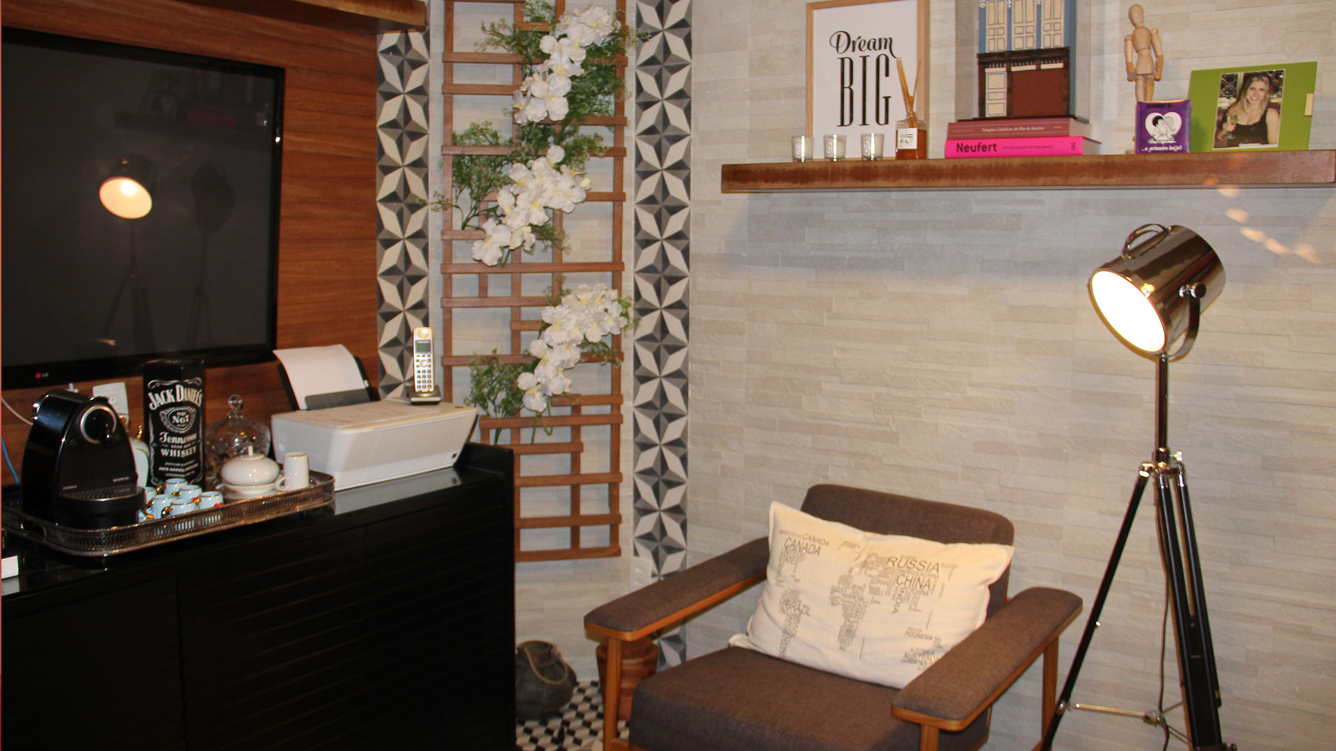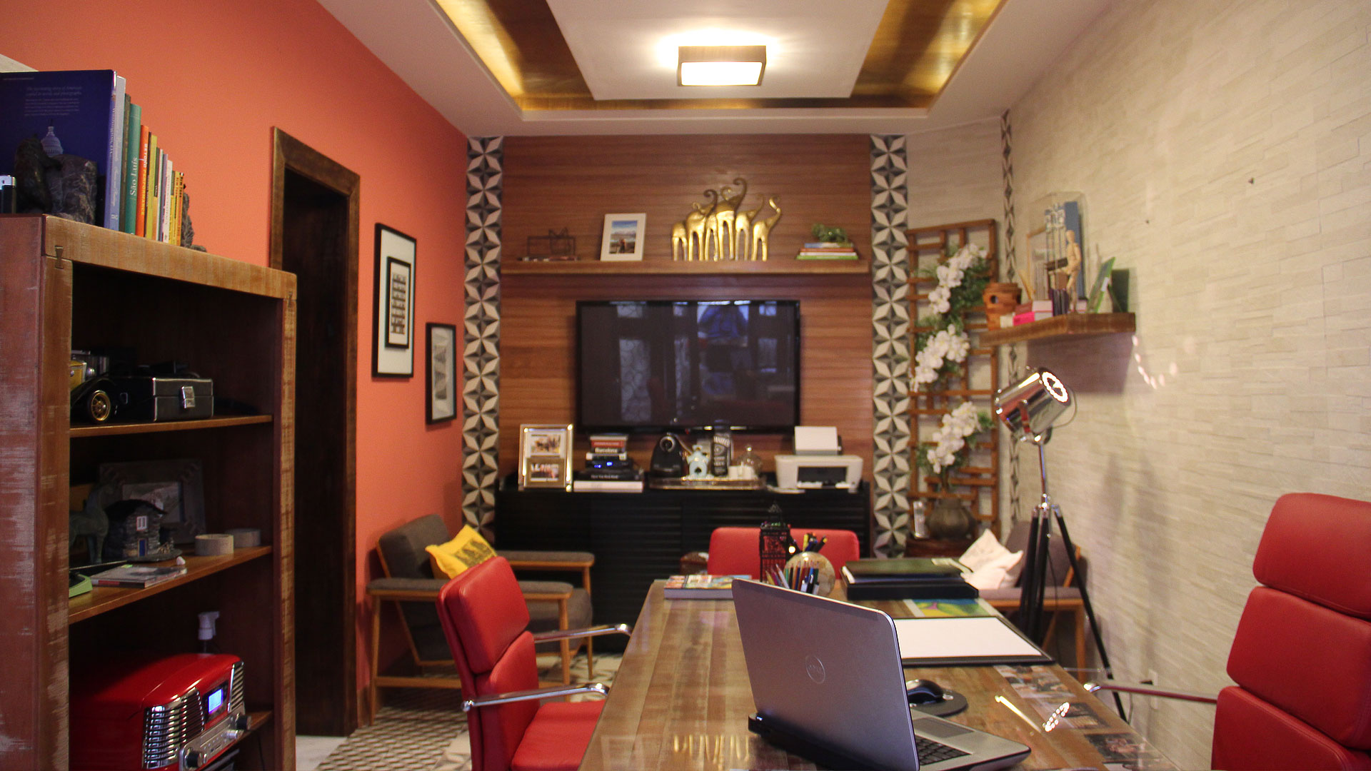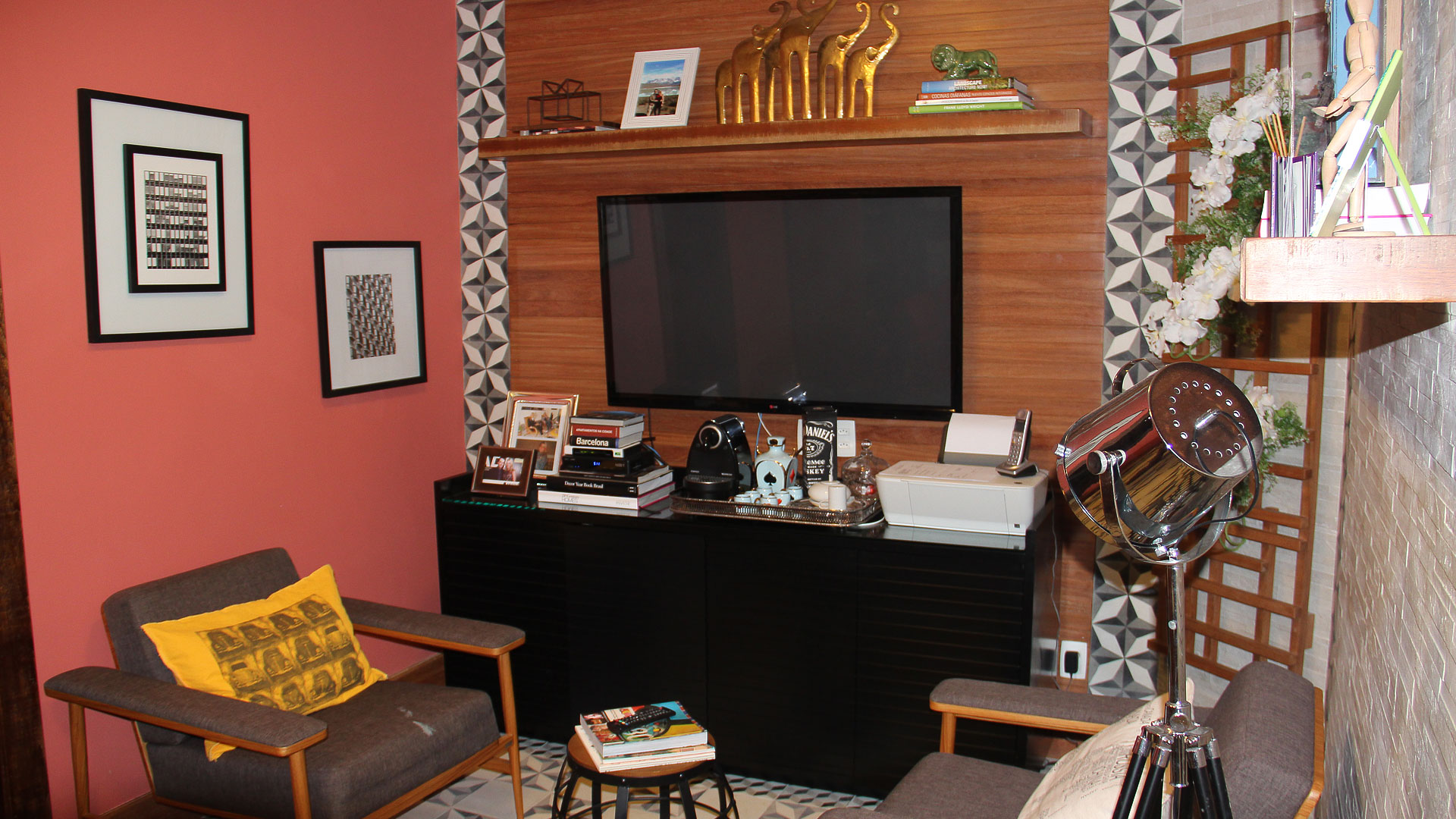 A paleta de cores é composta por uma combinação do tom terracota com o preto e branco de ladrilhos hidráulicos. O toque rústico do ambiente ficou por conta da madeira usada no forro de gesso, no painel da TV e nos mobiliários, contrastando com a parede branca. O resultado foi um escritório cheio de charme e design.
