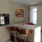 Como havia pouca área para colocar uma mesa de jantar, o espaço entre a sala e a cozinha foi dividido por uma bancada branca laqueada. Solução que proporcionou total integração aos ambientes, sem perder a privacidade.