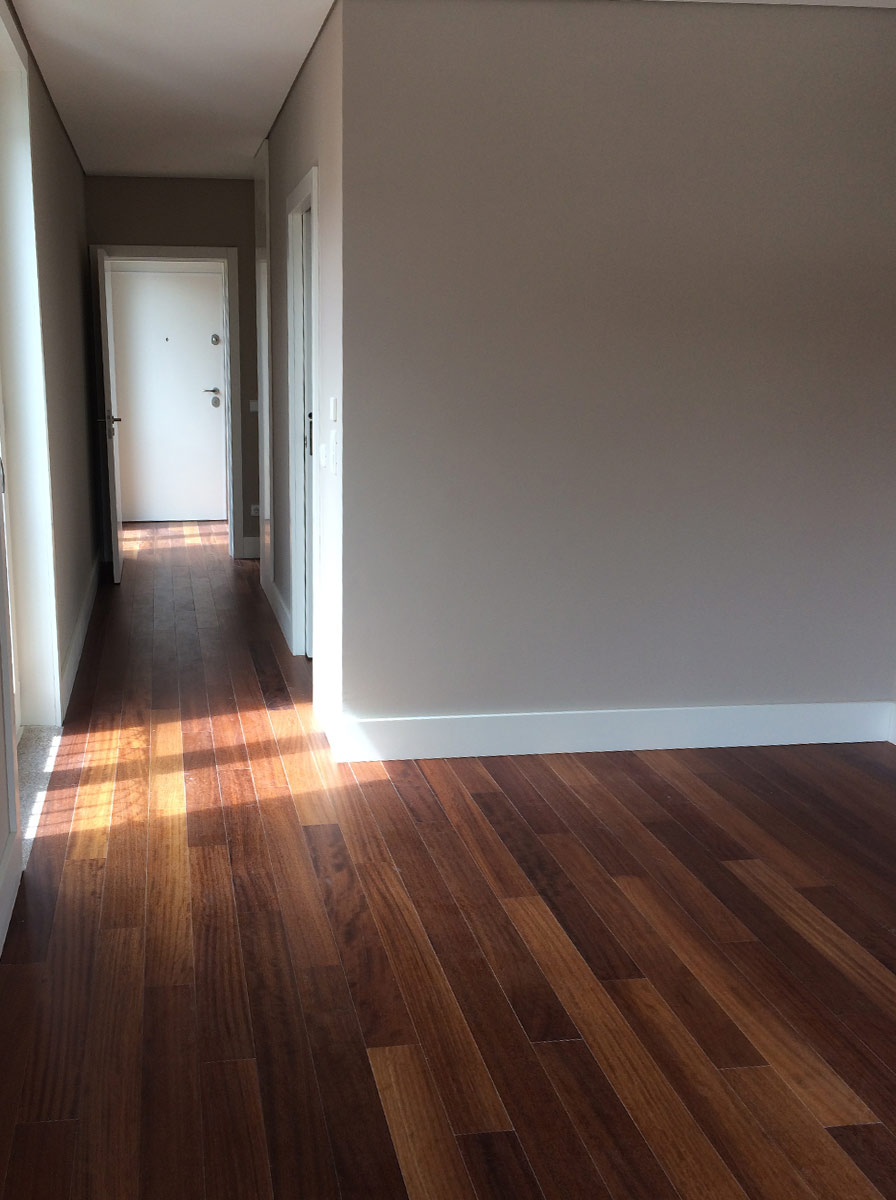 O piso foi aquecido por um sistema de calefação eficiente e de baixo consumo, composto de cabos calefatores elétricos instalados sob o tipo de piso escolhido (taco) e controlados por um termostato de ambiente.