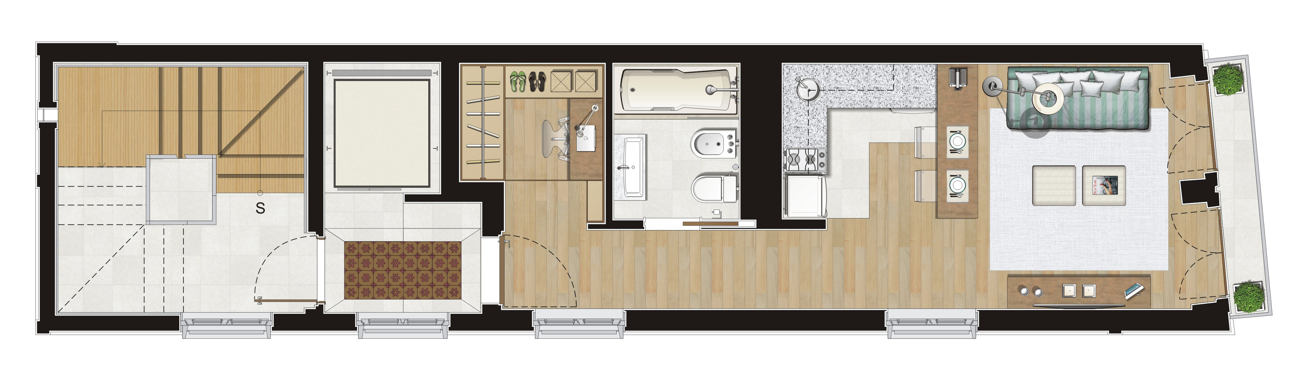 É um apartamento compacto e muito bem planejado, incluindo copa/cozinha, sala/quarto, banheiro e closet.