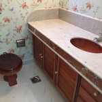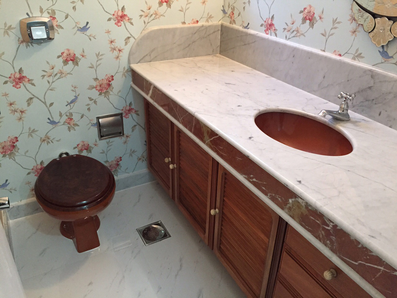Para fazer a composição e a integração com os demais materiais, usei cores claras, como o piso e a bancada em mármore carrara, com bordas boleadas, para deixar o ambiente mais romântico.