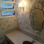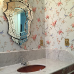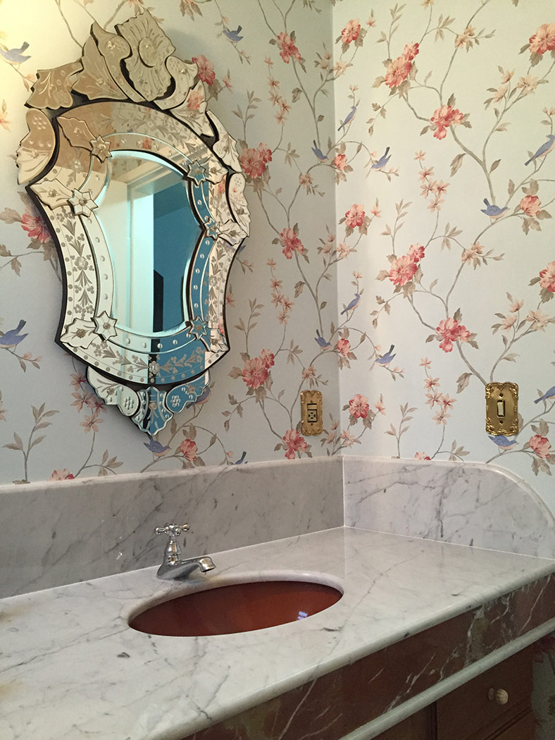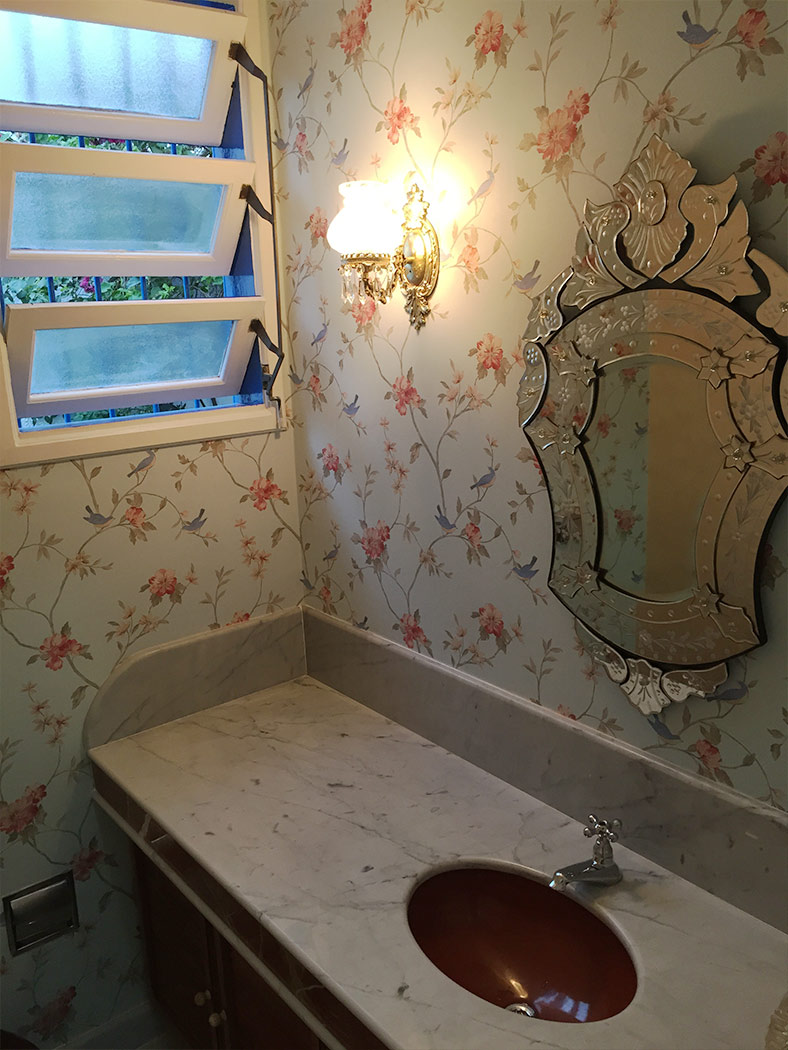 Na parede, foi utilizado um lindo espelho veneziano e na iluminação, uma cúpula pintada a mão, com flores rústicas, garimpada em uma loja de antiguidades.